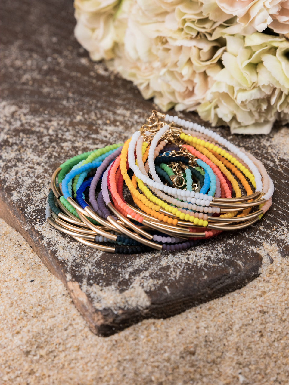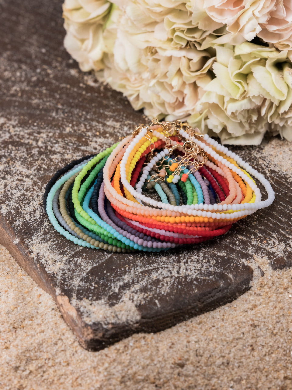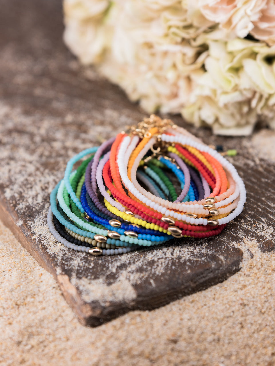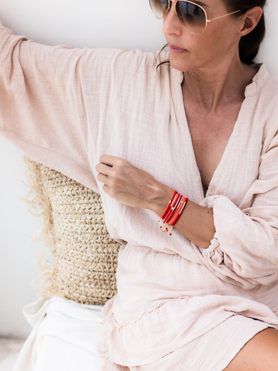 Un mix & match de 12 bracelets MILAN, LONDRES & PARIS. Couleurs: CORAIL, TANGERINE, ROUGE & FRAMBOISE.