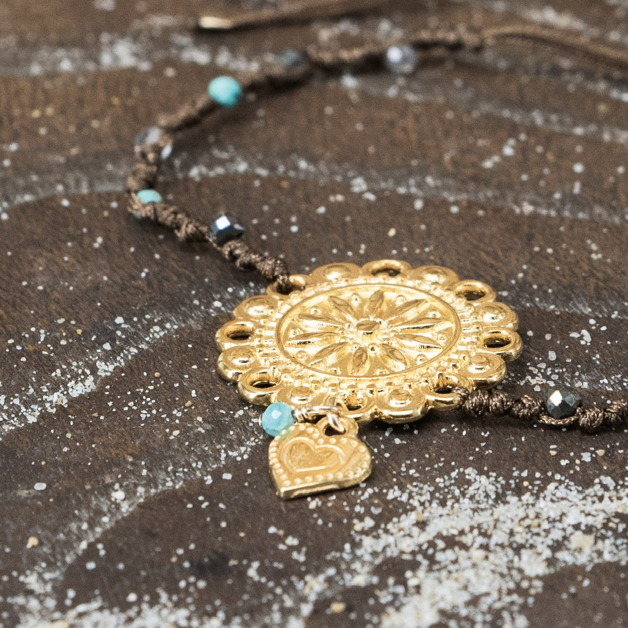Une médaille solaire et un jeu de textures aux couleurs de l’océan rendent ce gri-gri à la fois précieux et un brin bohème. On craque pour cette association de matières qui illuminera votre poignet.